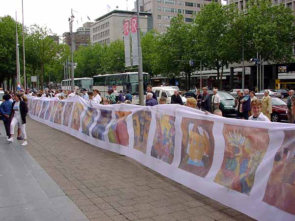 Alderman J.C. Kombrink unrolls the forty meter banner with thirty years of children's art